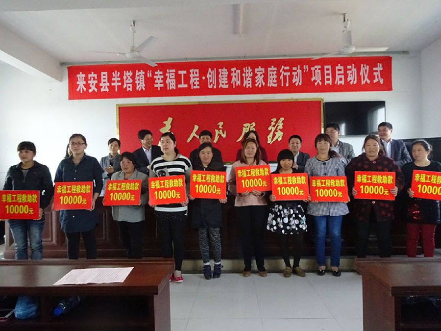 幫助困境母親,建設(shè)幸福家庭2015年4月24日,來安縣半塔鎮(zhèn)“幸福工程—創(chuàng)建和諧家庭行動”項目啟動儀式在半塔鎮(zhèn)羅莊村舉行。省計生協(xié)會秘書長張慶安,省計生協(xié)會綜合處主任科員朱霞,市衛(wèi)計委副主任蔣玲,市計生協(xié)會秘書長汪洋,縣委常委、副縣長凌文東,縣計生委主任李金柱,縣計生委副主任王芳和半塔鎮(zhèn)鎮(zhèn)長董文增出席啟動儀式,受助對象,協(xié)會會員等50多人參加了啟動儀式。
