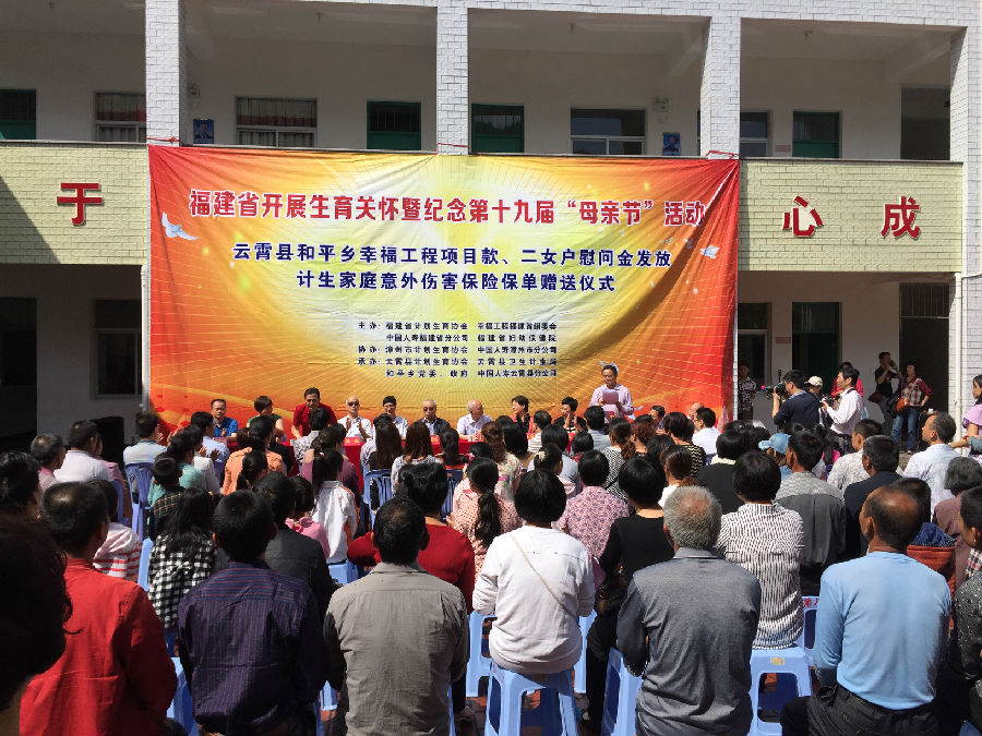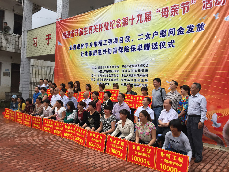 幫助困境母親,建設幸福家庭5月9日,為擴大幸福工程影響力,展示幸福工程救助成果,造福更多貧困母親,福建省計生協(xié)會、幸福工程福建省組委會、中國人壽福建分公司、福建婦幼保健院專家在云霄縣和平鄉(xiāng)開展生育關懷暨紀念第十九屆“母親節(jié)”活動。