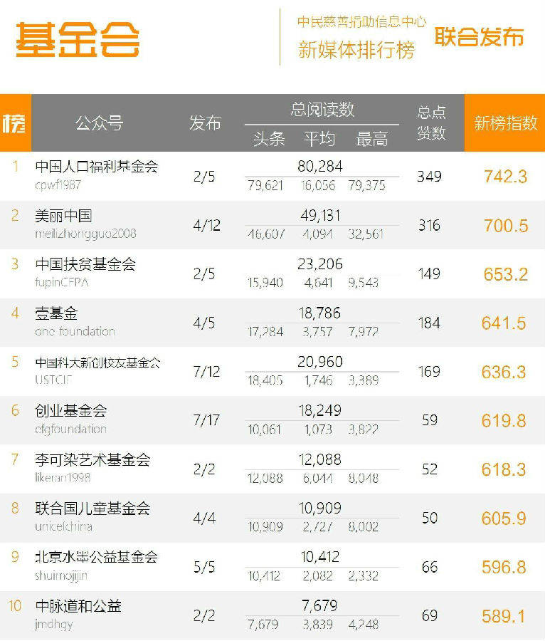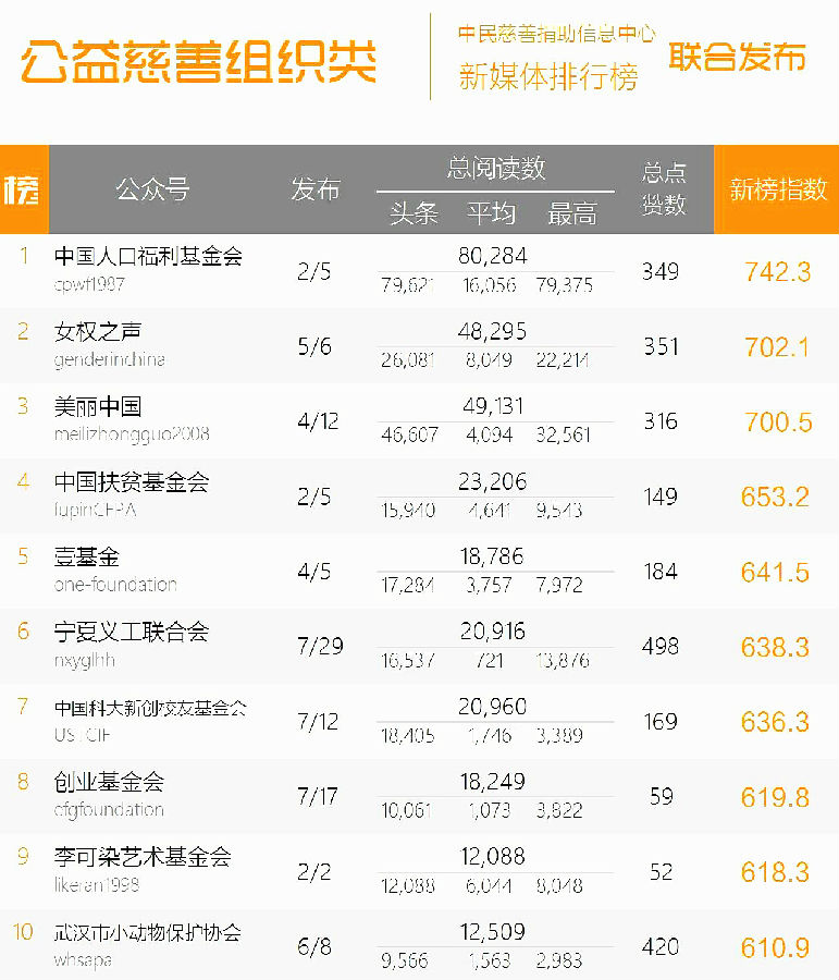 News“中國慈善微信影響力排行榜”于2015年3月由中民慈善捐助信息中心與新媒體排行榜聯(lián)合推出,監(jiān)測范圍涵蓋全國5000余家公益慈善類媒體、組織、企業(yè)和自媒體人開設(shè)的共971個微信公眾賬號。