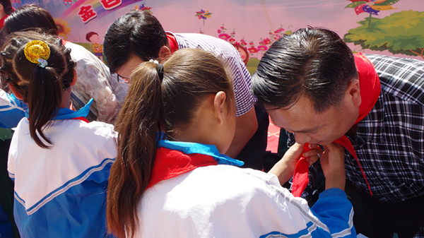 同學們為遠道而來的叔叔、阿姨獻上紅領巾
