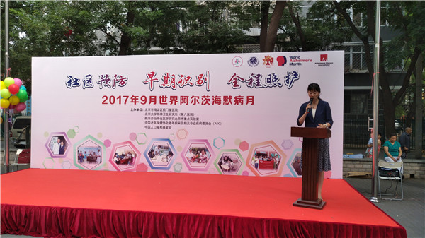 中國阿爾茨海默病協(xié)會(huì)(ADC)副主任委員兼秘書長解恒革,中國阿爾茨海默病協(xié)會(huì)(ADC)副主任委員兼副秘書長王華麗,中國人口福利基金會(huì)項(xiàng)目主管楊辰,海淀區(qū)精神衛(wèi)生防治院院長李文秀,北京市海淀區(qū)薊門里醫(yī)院主任劉雷、書記畢亮,西城區(qū)睦友社會(huì)工作事務(wù)所顧穎,以及阿爾茨海默病患者和家屬,薊門里社區(qū)群眾等到場參加。